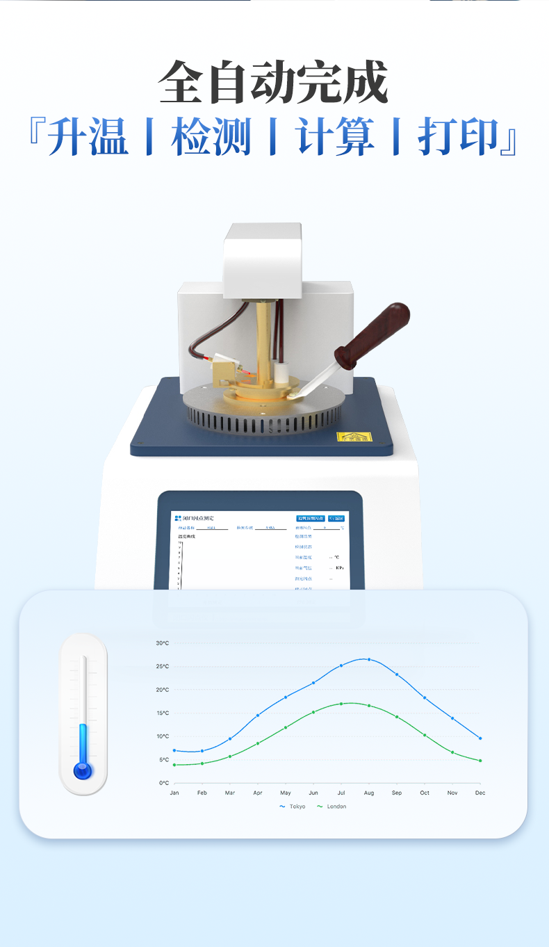 儀器按照GB/T 261-2021方法規(guī)定的升溫曲線加熱,溫度接近預(yù)期閃點值時自動點火,當(dāng)出現(xiàn)閃點時儀器自動鎖定結(jié)果,并顯示和打印,同時啟動風(fēng)機自動對加熱器進(jìn)行冷卻。