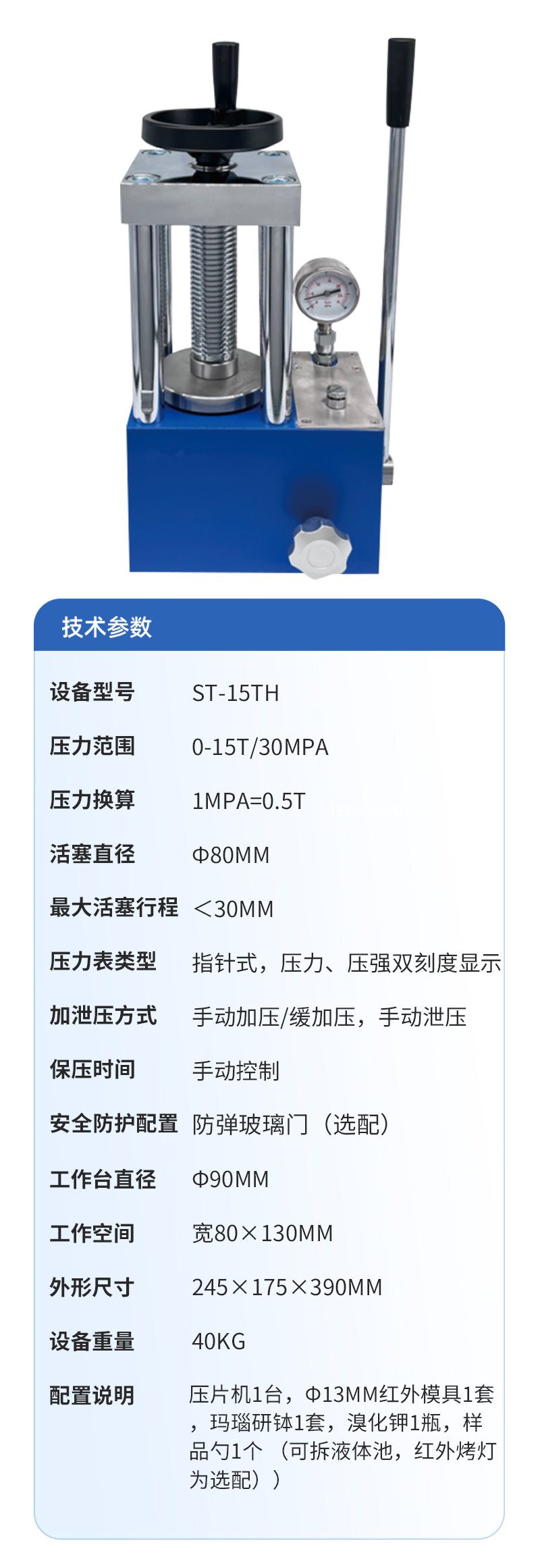 | 壓力范圍 | 0-15T/30MPa |