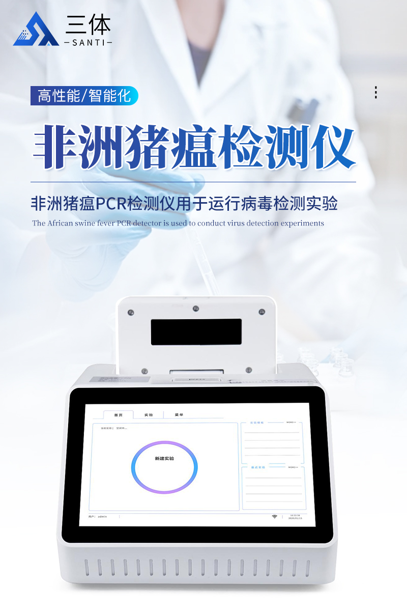 非洲豬瘟PCR檢測(cè)儀(實(shí)時(shí)熒光定量PCR儀支持變溫檢測(cè))用于運(yùn)行病毒檢測(cè)實(shí)驗(yàn),并對(duì)實(shí)驗(yàn)數(shù)據(jù)進(jìn)行分析;儀器既可在實(shí)驗(yàn)室內(nèi)操作,又可用于野外科學(xué)實(shí)驗(yàn),配合相應(yīng)試劑,對(duì)取自待檢測(cè)樣本的分析物或其他分析物中的目標(biāo)核酸進(jìn)行快速、準(zhǔn)確的定性檢測(cè)。